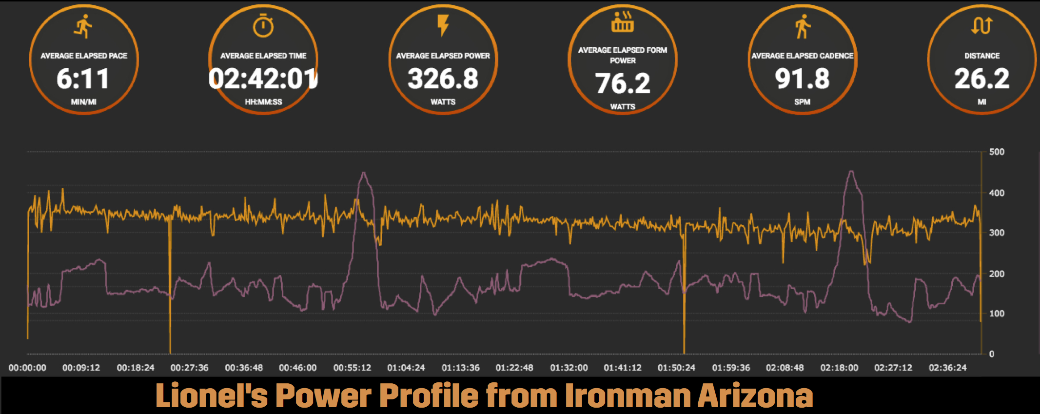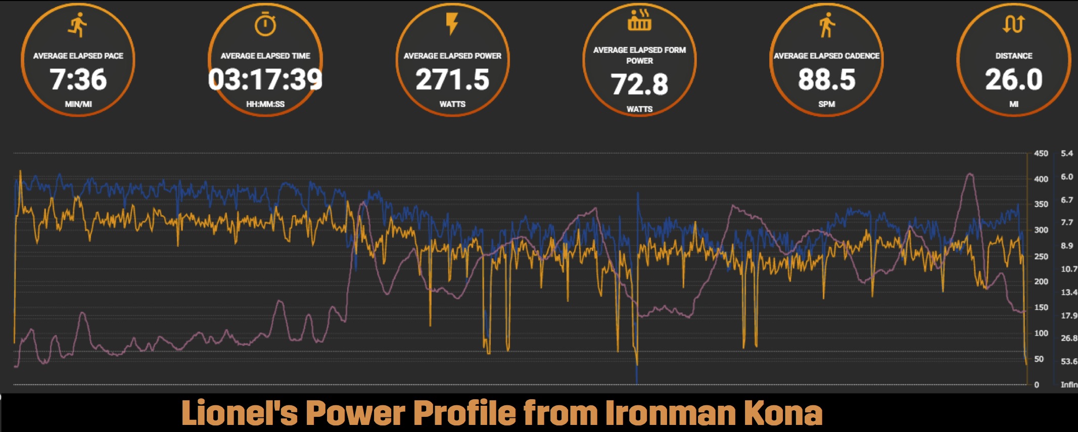 Unfortunately, the run did not go as planned. Lionel's endurance was not where it needed to be. His power profile from Kona shows that he averaged 320 watts and 6:25 min/mile for the first 10 miles, but only 250 watts and 8:20 min/mile for the final 16.