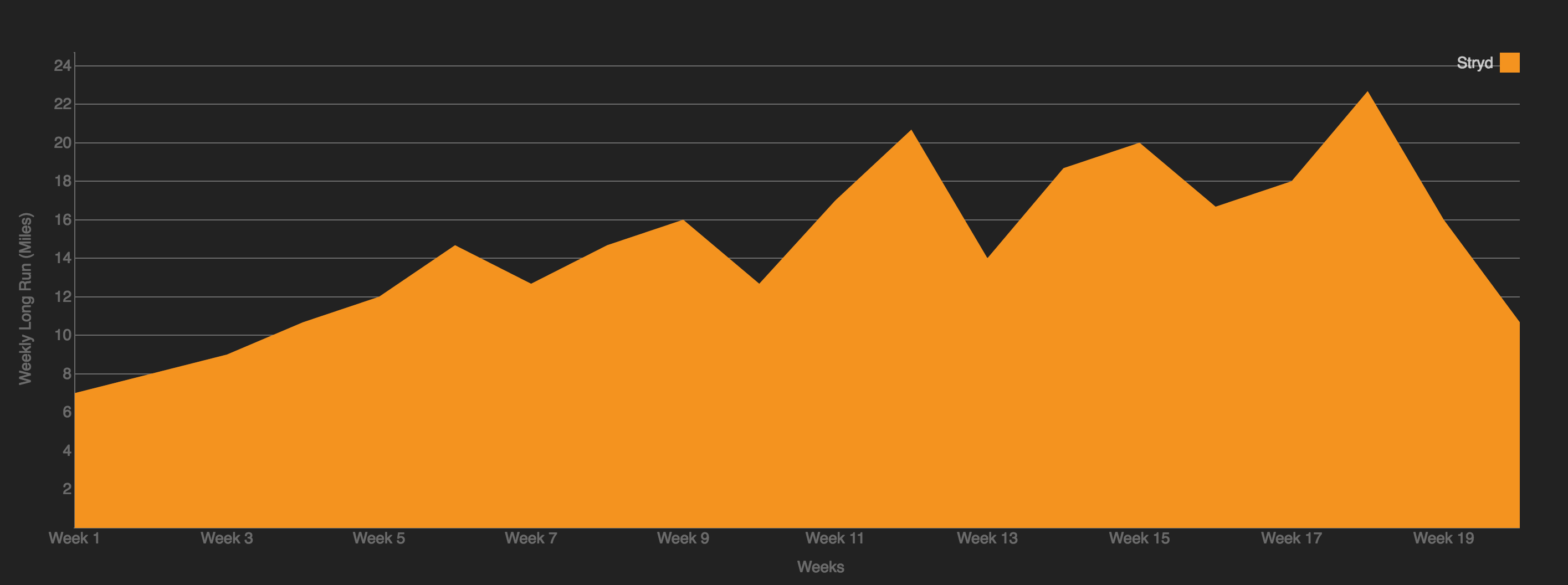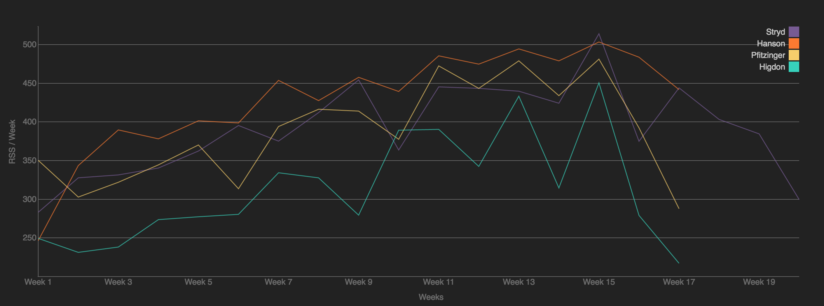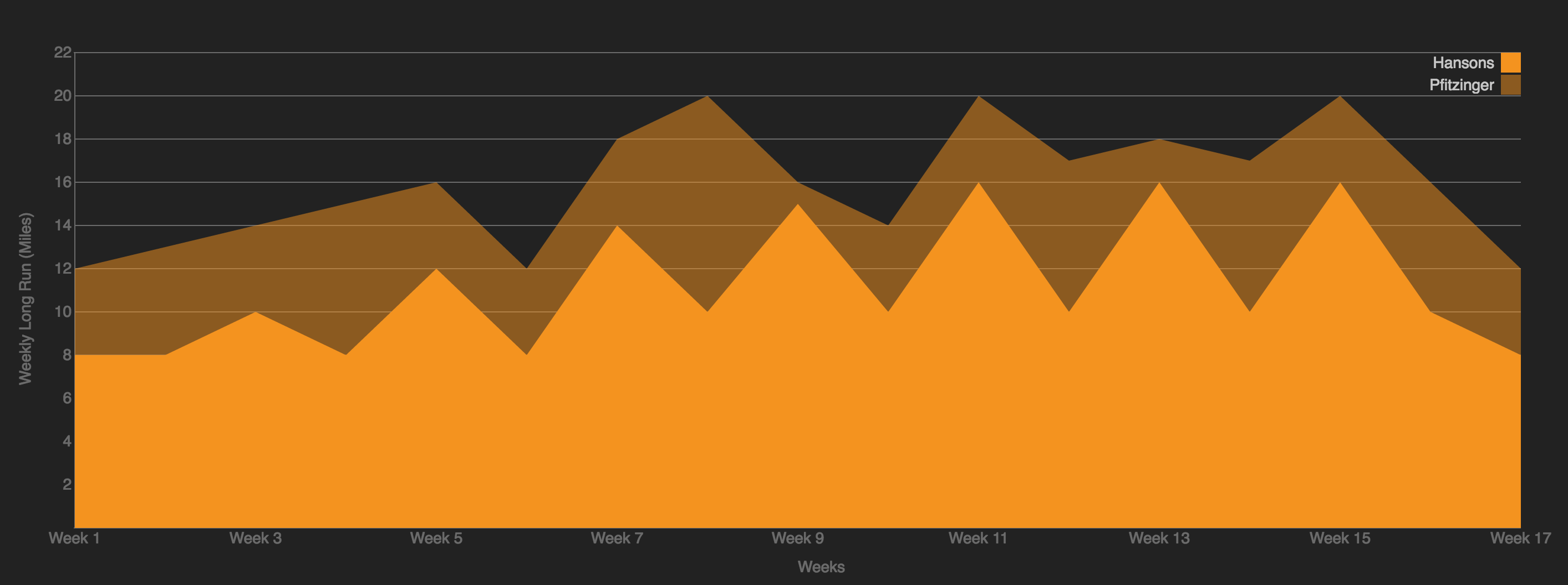 How do different training philosophies influence training practices? The following plot compares two of the Marathon plans developed by two world-known coaches. Hansons’ plan consists of a sequence of micro-training cycles, e.g., a three-week intensive training with one-week recovery. On the other hand, the weekly long runs in Pfitzinger’s plan are significantly longer than that of Hanson’s plan, with less volume reduction during the tapering phase. These observations show how RSS can be used to concisely describe each particular training philosophy.
