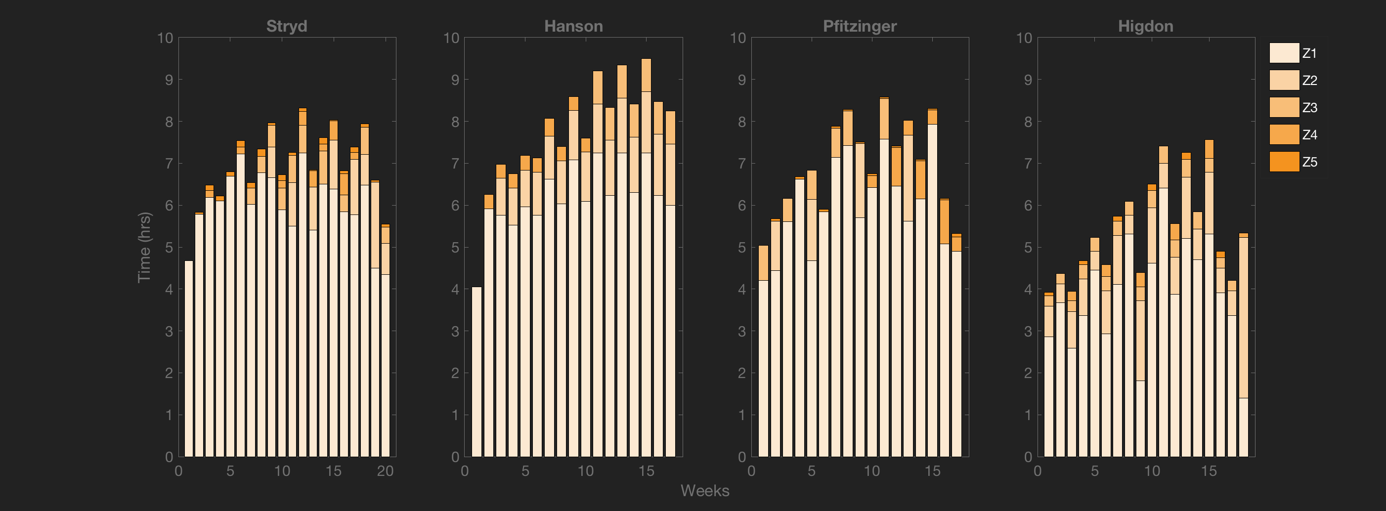 How does workload progress throughout a training season? The following plot shows the weekly RSS of four widely used Marathon training plans developed by four world-known coaches. It is interesting to see that, even though the four training plans were developed by coaches with different training philosophies, they exhibit similar workload progression throughout a training season. Specifically, for all four plans, workload ramps up over the base phase with an approximate 5-10% week-by-week increase. Workload peaks about two-thirds into the training season, and the volumes all decrease sharply during the tapering phase. In addition, the training intensity zone breakdowns all follow similar patterns across all four training plans. For instance, high-intensity run training is rare during the base phase across all four training plans. Clearly, there is common consensus in terms of the basic training principles.
