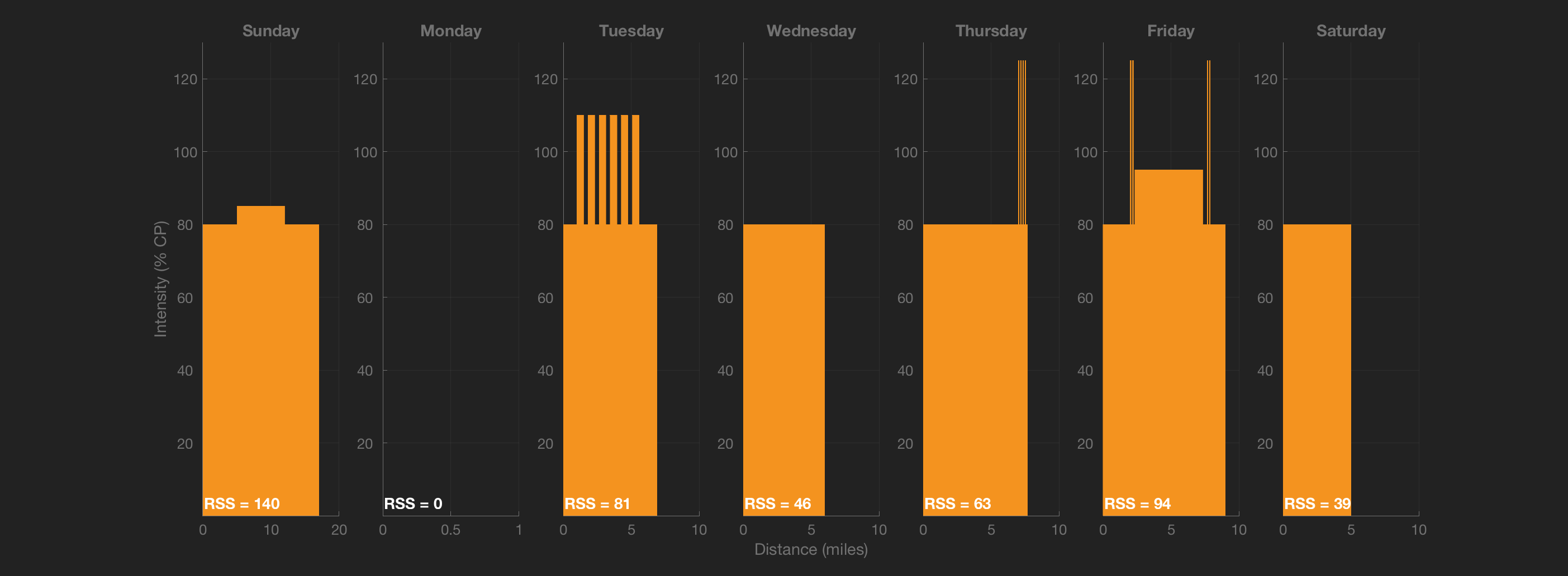 How to plan a weekly workout? All four training plans also follow similar weekly workout compositions during the quality training phase, e.g., intervals and hill repeats, recovery runs, and weekend long runs. The following plot shows an exemplary weekly workout, which consists of three high-quality workouts, spread across the week, and separated by recovery runs and a resting day. All high-quality workouts show similar training workload, i.e., RSS score, but with distinct intensity composition. Again, how much you train (overall workload) and how you train (variety) are the key factors to effective training.
