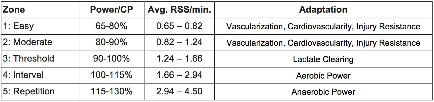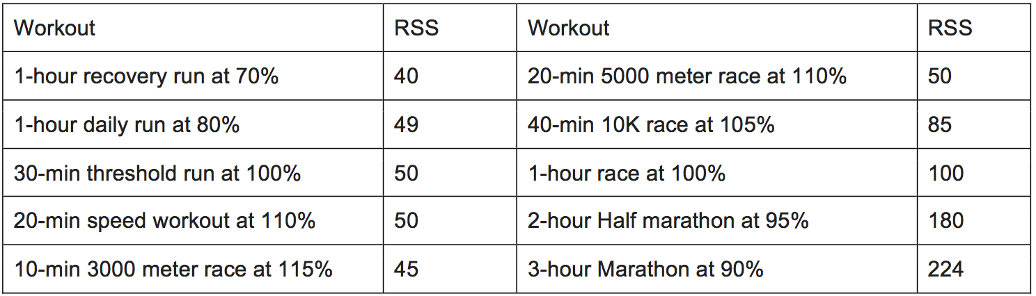 Simply put, RSS is a point system, awarding a certain number of points to each of your workouts, based on how intensely and how long you train. RSS is designed around a reference benchmark score, such that if you run for exactly one hour at your critical power, you will earn 100 RSS points. The following two tables show the RSS score for one-minute of running at different intensity zones (levels), as well as the typical RSS found in a set of common workouts and races.