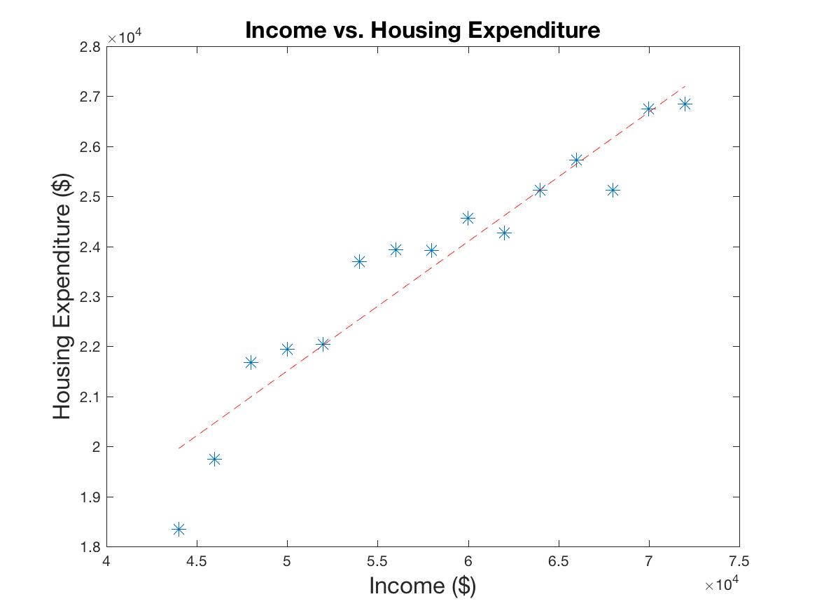 Figure 1a: Income vs. Housing Expenditure. The line shows the best linear fit to the data: R=0.95.
