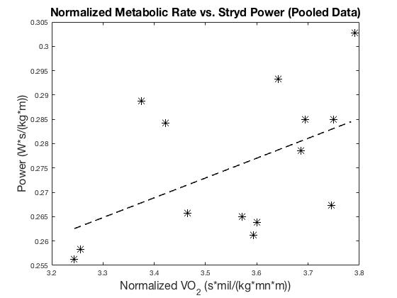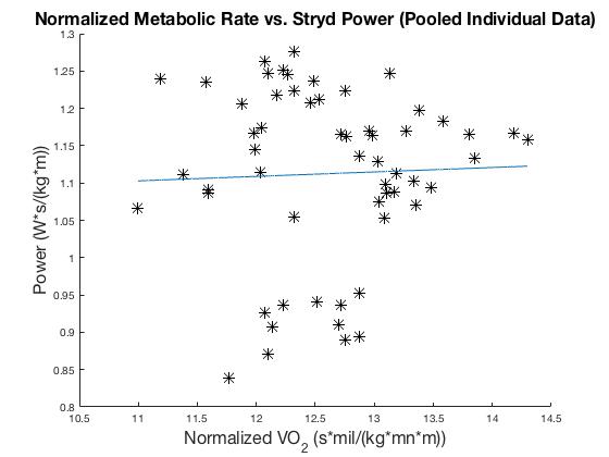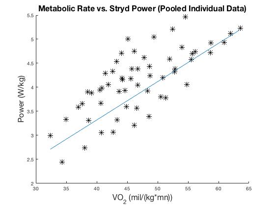 To do a proper statistical analysis of non-normalized, non-averaged data collected using consistent data collection methods, we used individual rate of oxygen consumption and Stryd power data we had previously collected on 10 subjects across a range of velocities using the Stryd Pioneer used in the paper. We used an increasing speed, ramp-up protocol with a minimum of 4 minutes per trial, but additionally examined slope to determine that all subjects had reached steady state for all metabolic data used in analysis. We then fit these data both on a subject-by-subject basis, as Stryd is designed to be used, and then using the pooled individual data, to again provide a lower bound for a correlation coefficient. We used both the proper, non-normalized measures (Figure 4a), and the measures normalized by speed, as was performed in the paper (Figure 4b).