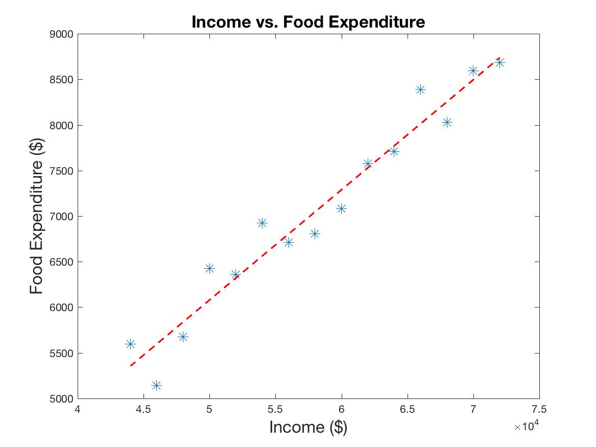Figure 1b: Income vs. Food Expenditure. The line again shows the best linear fit to the data: R=0.97.