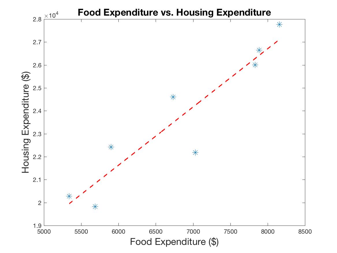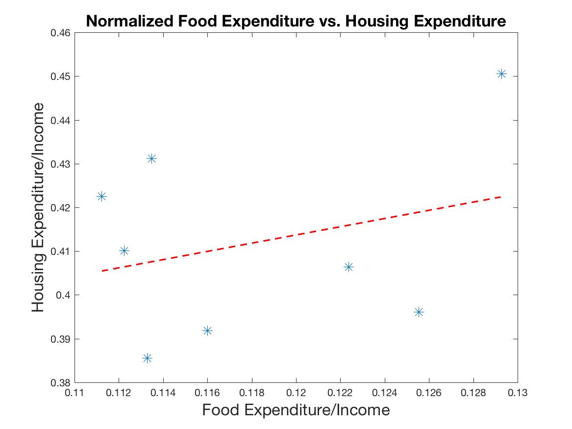 Now, since both housing and food budgets are linearly dependent upon income, graphing the one vs. the other also leads to a strongly linear relationship.