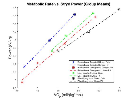 Figure 3a: Group mean data and best linear fits the group means for recreational and elite runners overground and on a treadmill. All individual fits had R>0.99.