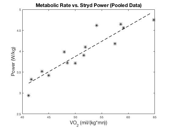 Clearly, even with variability across groups and conditions introduced into the relation, there is still a very strong linear relationship between the rate of oxygen consumption values and the Stryd power values.