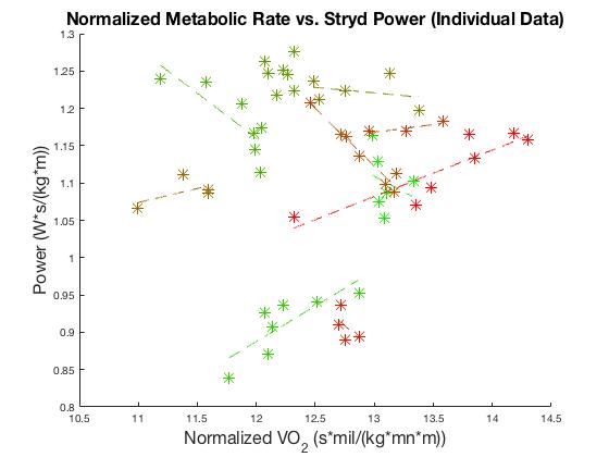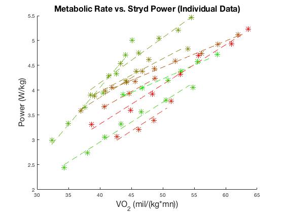 How to properly aggregate your data for correlation analysis depends upon what you are trying to determine. The purpose of the paper as stated is to assess the use of power as a training metric, and its conclusion is that power is not a sufficient surrogate for metabolic cost. However, this paper aggregates data across subjects and then correlates, whereas our training metrics are tailored to the individual, use their anatomical data as inputs, and should only be tested on an individual basis.