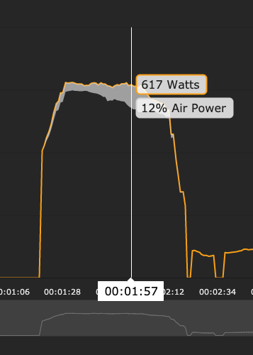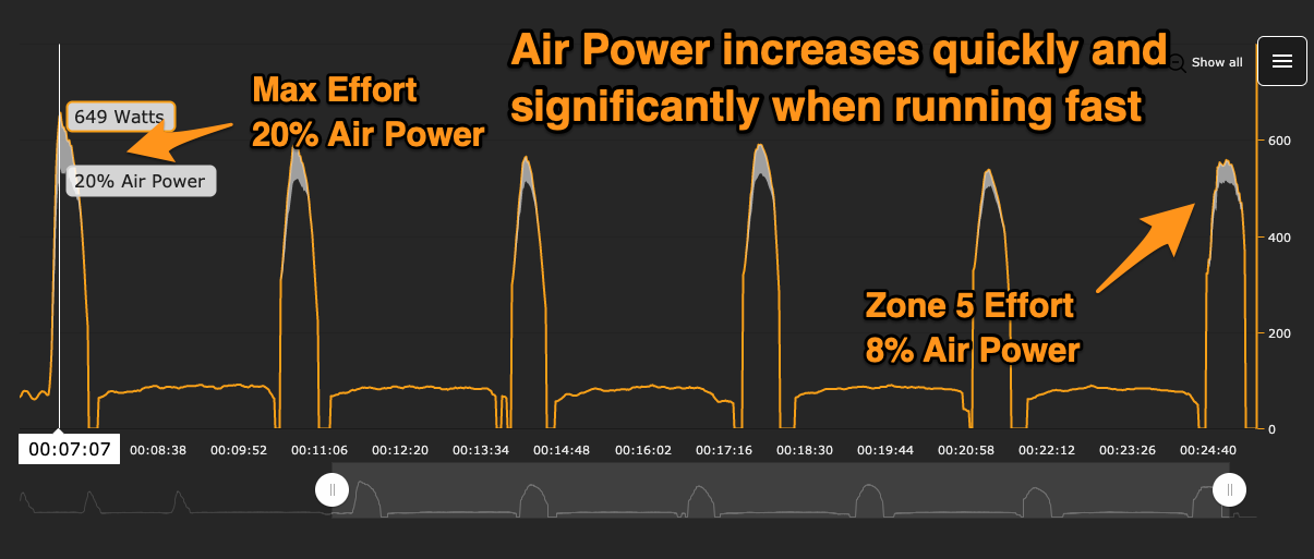 For example, here is a sprint effort where the runner is producing 617 watts of power. 12% of that power is Air Power and is being used purely to overcome air resistance.