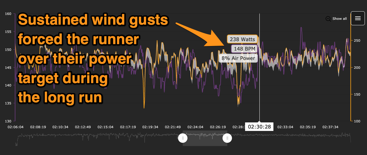 In wind conditions like this, the runner has the choice to tailor their workout to suit their needs. They can choose to do all the intervals directly into the wind so they can reach high end power numbers without having to suffer from injury-inducing impact from going at high end speed.