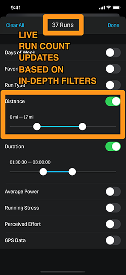 Within the filtering screen, you can enable a single filter, or multiple. The number of runs that meet the filter parameters will live update.