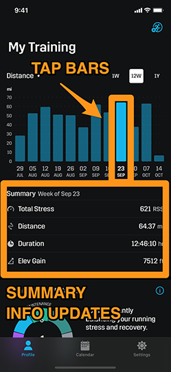 Taps on the bar graph let you quickly quantify your Run Stress from month-to-month, week-to-week, and day-to-day.