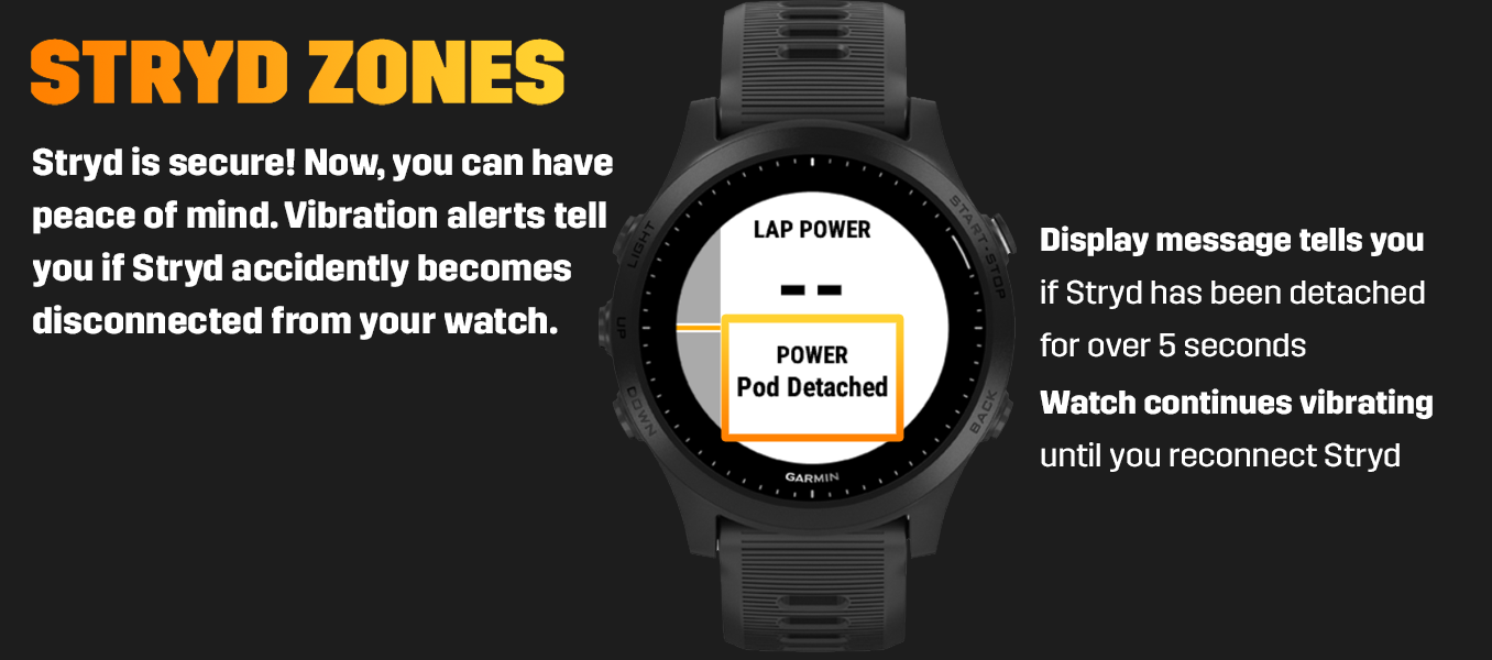 A display message will let you know that the “Pod Detached” and the watch will vibrate until you reconnect Stryd.
