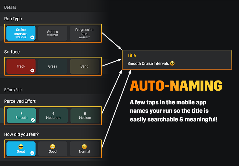 With auto-naming, when you include a run type, perceived effort and how you felt, the title of your run will automatically update.