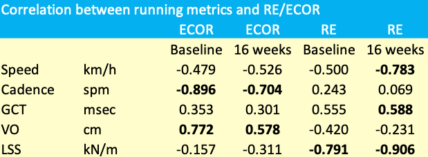 Regarding RE, the results confirm that RE is lower at higher speed and at lower GCT. Both correlations were statistically significant (after 16 weeks, indicated in bold) and are in line with literature findings The correlations between RE and cadence and vertical oscillation are counterintuitive, but these are weak and probably reflect the fact that RE is the integrated composite result of many parameters. The most striking result is the strong and statistically most significant correlation (even at the 0.001 level) between RE and LSS.