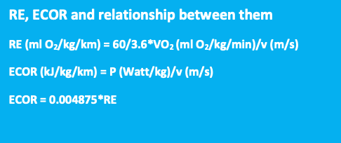 So ECOR can be made available by an easy calculation as often as desired. Economical runners use less mechanical energy, their ECOR is lower than 1.0 kJ/kg/km. In our book The Secret of Running3 (www.thesecretofrunning.com), we have derived the theoretical relationship between RE and ECOR, as presented in the box.
