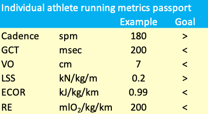 We feel that we are slowly unraveling the complex multifactorial concept of RE. Many factors play a part and the optimum running style will differ from person to person. So, we have started to develop an individual running metrics passport for all the runners in the Team Seven Hills. The idea is that depending on the individual characteristics each person can be coached to improve his running style. The running passport will include physiological data, such as VO2 max, HR max, lactate threshold etcetera, but also the running metrics. The table below gives a first draft of such a running metrics passport.