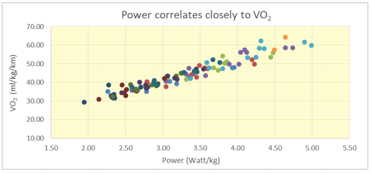 The project included measuring the VO2 (in ml O2/kg/min) and Stryd power (in Watt/kg) of 21 runners (11 trained and experienced distance runners and 10 untrained students) at 5 different speeds (maintained during 3 minutes, increased in 4 steps of 1 km/h to lactate threshold). This means that we got a total of 21*5 = 105 data of VO2 and power. The figure below shows the data base (the colors correspond to the different speeds and test groups, trained or untrained). The correlation between VO2 and Stryd power is quite impressive and even more so when we realize that these data points represent a heterogeneous set of runners (trained and untrained) and test conditions (low speed up to lactate threshold speed). This confirms our earlier findings that the daily Stryd power data can be used very well to provide an alternative for the once-a-year determination of the VO2 max in a physiological laboratory.