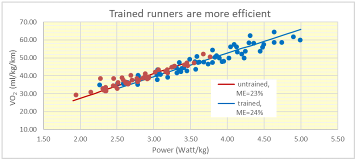 A striking result is that we found that most of the scatter in the data can be eliminated when we divide our test runners in 2 groups, i.e. trained and untrained runners. Trained runners need about 4% less oxygen, so they have a somewhat lower VO2 (in ml O2/kg/min) at the same power P (in Watt/kg). This means that their Metabolic Efficiency (ME) must be higher. In our book, we have derived the following relationship for the ME: