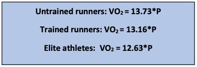 We note that our trained runners were experienced distance runners with many years of training. However, they were not of the elite level. We expect that the ME of elite athletes may approach the theoretical maximum of 25%. Consequently, elite athletes could use the formula: VO2 = 12.63*P.