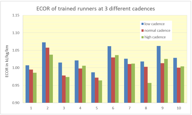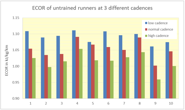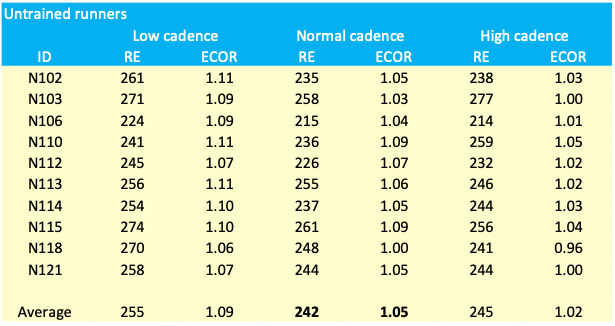 As cadence increases, the ECOR reduces slightly but consistently. For trained runners the reduction is 3%, for untrained runners it is bigger (6%). The reduction of ECOR is probably related to the reduction in vertical oscillation, that occurs simultaneously when cadence is increased at the same speed.