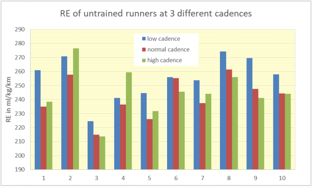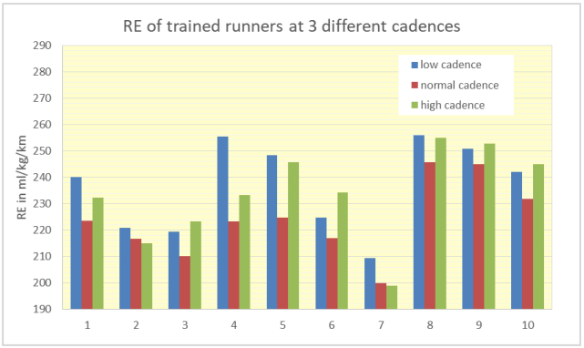 Regarding RE, the impact is less consistent. A lower cadence always leads to an increase in RE, but a higher cadence usually does not. It seems that regarding RE the self-selected cadence is usually the best. This complies with earlier reports in literature, where other researchers have also found that the self-selected cadence is best in terms of oxygen use and RE.