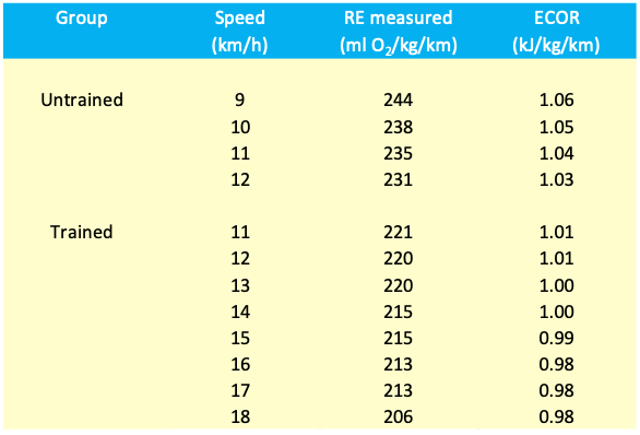 We have summarized the results for the two groups and the different speeds in the table below. One of the most striking findings is that trained runners were consistently more economical than untrained runners, both in terms of the mechanical energy that they needed for running (ECOR) as well as the amount of oxygen that they used (RE). The average RE of untrained runners was 237 ml O2/kg/km which was 10% higher than the average for trained runners (215 ml O2/kg/km). The average ECOR of untrained runners was 1.04, which was 5% higher than the average for the trained runners (0.99 kJ/kg/km). We conclude that training results in 2 important benefits:
