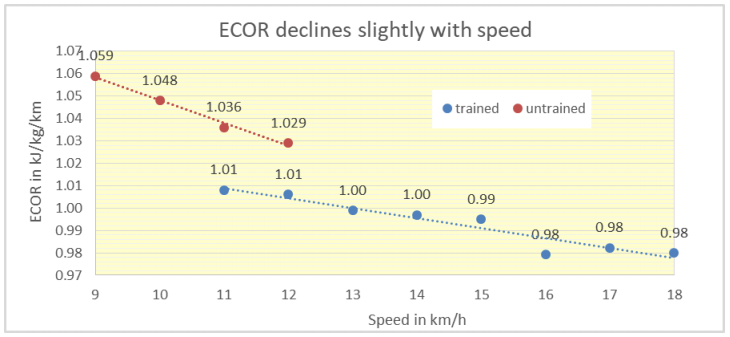 As an example we use a P of 3.4 Watt/kg and a speed of 12 km/h (3.33 m/s), so the ECOR is 3.5/3.33 = 1.02 kJ/kg/km.
