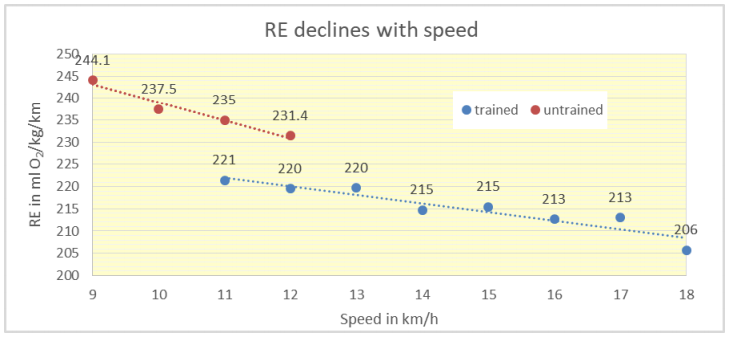 As an example we use a VO2 of 45 and a speed of 12 km/h (3.33 m/s), so the RE is 60/3.6*45/3.3 = 225 ml O2/kg/km.