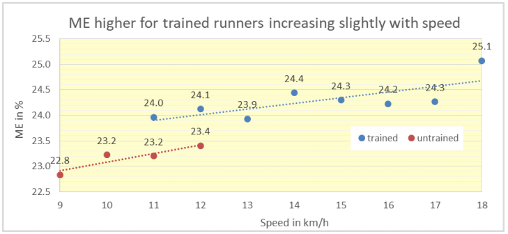 In the earlier paper (#24), we already noted that the ME of our trained runners was higher than that of the untrained runners (24% vs 23% or a relative increase of 4%). This explains the discrepancy between the 10% difference in RE as compared to the 5% difference in ECOR of the two groups.