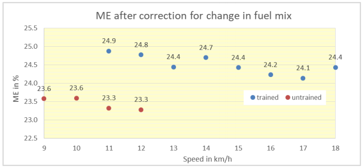From a physiological point of view, we can understand the different responses of ECOR and RE with speed. As speed increases, the fuel mix in the muscles switches gradually from fatty acids to glycogen. Glycogen produces some 12% more energy per liter of O2 as compared to fatty acids (19.8 J/ml vs 17.6 J/ml) so less oxygen is required. We have prepared the two figures below to illustrate this effect. In the first figure, we have calculated the theoretical metabolic efficiency (ME) based on a constant average energy yield (EY) of oxygen of 19 J/ml. This seems to indicate that the ME increases slightly with speed. However, in the second figure we have corrected for the expected change in fuel mix, which results in the more likely result that the ME is more or less constant with speed (but differs significantly for trained and untrained runners as stated before).