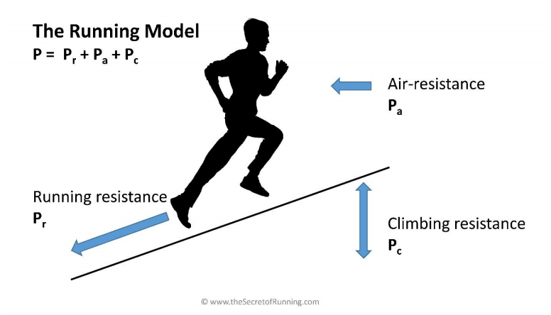 Traditionally, runners use pace as a surrogate for their effort during racing. Theoretically, the effort during running is defined by the power of the ‘human engine’. In our book “The Secret of Running" (www.thesecretofrunning.com) we have shown that in running the total required power P is the sum of the power required to overcome the running resistance Pr, the air-resistance Pa and the climbing resistance Pc, as indicated in the figure below.