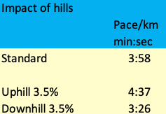 Uphill the required power increases and downhill it decreases as a result of gravity. As it is always best to run at constant power, this means that uphill you should reduce your pace to maintain constant power. Uphill the reverse is the case. The table below shows the impact of a hill with a gradient of 3.5% on the correct pace of the author (Net Functional Threshold Power 250 Watt, body weight 58 kg, P= 4.31 Watt/kg). Obviously, the impact will be even bigger at steeper gradients, as the energy cost of hills is proportional to the gradient!