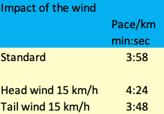Facing a head wind, the required power increases, while it decreases in a tail-wind. As it is always best to run at constant power, this means that in a head wind you should reduce your pace to maintain constant power. In a tail wind the reverse is the case. The table below shows the impact at a wind speed of 15 km/h (at breast height) on the correct pace of the author. Obviously, the impact will be even bigger at higher wind speeds, as the energy cost of the air-resistance is proportional to the square of the wind speed!