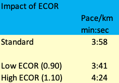The ECOR is typically 0.98 kJ/kg/km, which corresponds to a Gross ECOR of 1.27 kJ/kg/km. Of course, this number will not be the same for everyone: it depends on many factors, including body posture, fuel mix and running form. Generally, it is believed that the Net ECOR of highly efficient elite runners could be as low as 0.90 kJ/kg/km, whereas in inefficient joggers it could be as high as 1.10 kJ/kg/km. Obviously, a lower ECOR means that you are running more efficiently and consequently you can run faster.