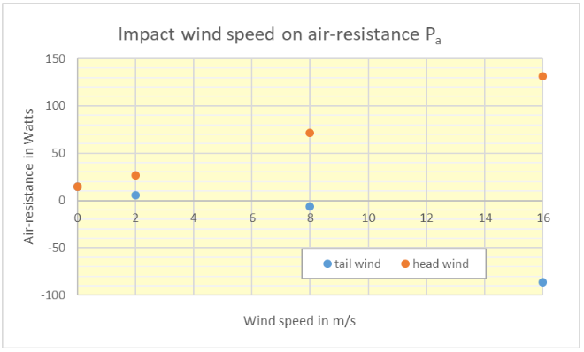We can see that at a head wind Pa increases from 14 watts to no less than 131 watts, which is almost half of the total power of 277 watts of Hans. At a tailwind, Pa decreases from 14 watts to -86 watts (the negative value indicates he literally gets a push in the back from the wind).