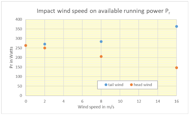 We have calculated this from the power balance: Pt = Pa +Pr. Earlier we saw that the Pt of Hans is 277 watts. Consequently, his running power (Pr) decreases as Pa increases (headwind) and vice versa Pr increases as Pa decreases (tailwind.)