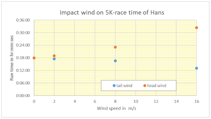 Finally, we have calculated the impact on the 5k-race time of a hypothetical race course with 1 K head wind, 1 K cross wind (45 degrees), 1 K cross wind (90 degrees), 1 K cross wind (135 degrees) and 1 K tail wind, This would lead to a race tome of 21:39, so more than 3 minutes slower than at no wind.