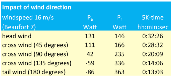 The table clearly shows that the impact is huge at this wind speed. The air-resistance changes significantly at different wind angels and so does the 5K-race time!