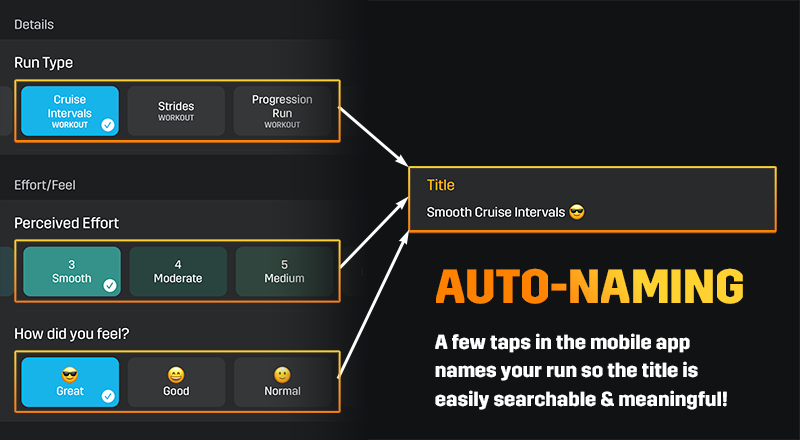 With auto-naming, you can include a run type, perceived effort, and how you felt. The title of your run will automatically update to give it a meaningful name.