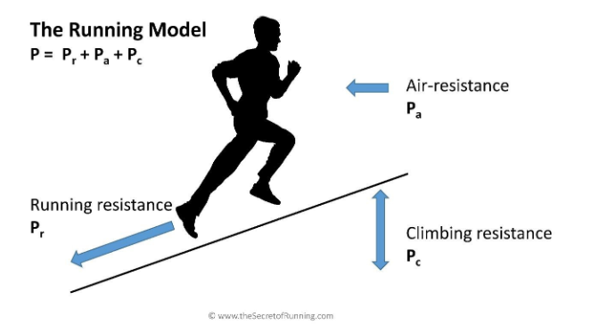 Many readers will be aware of our running model, which we have described in our book ‘The Secret of Running’ and in our papers. The figure below shows the basic concept of the model, namely that the power of the human engine P must be equal to the sum of the powers required to surmount the running resistance Pr, the air resistance Pa and the climbing resistance Pc.