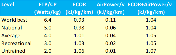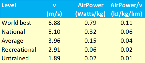 The relationship between the running speed of the different runners and the air-resistance or AirPower (in Watt/kg, we have used a body weight of 60 kg) and the Air Power/v (in kJ/kg/ km) is shown in the table below .