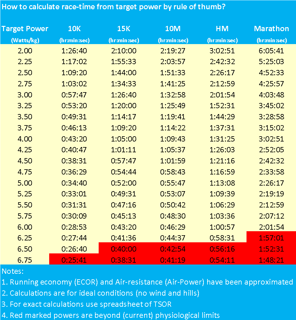 Below we first give some background information and then we present our new and simple formula and a handy table of race times with different values of your (specific) power. If you want to dive into the details, you should read on, because in the second part of this article we explain how we have derived the formula.