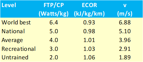 The relationship between the specific power, ECOR and running speed is (globally and simplified) shown in the table below: