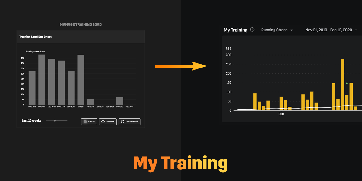 The new “My Training” chart plots out your training with Running Stress, Moving Time, Distance, and Elevation Gain to more easily identify trends