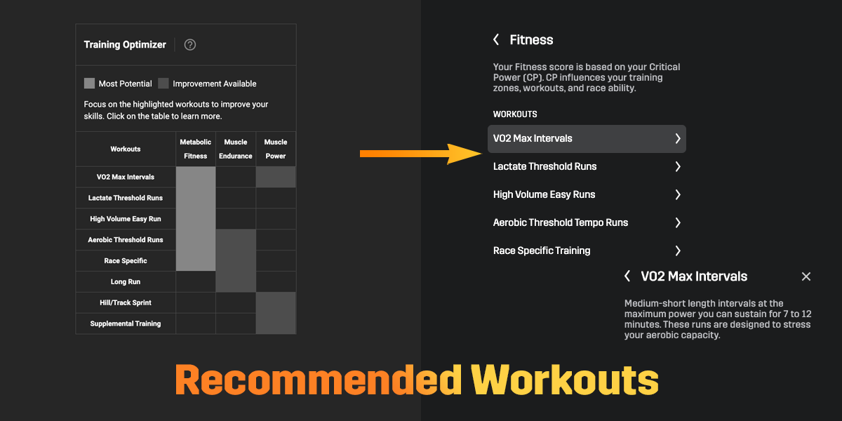 The "Recommended Workouts" feature tells you the types of workouts to incorporate into your training if you want to improve your skills.