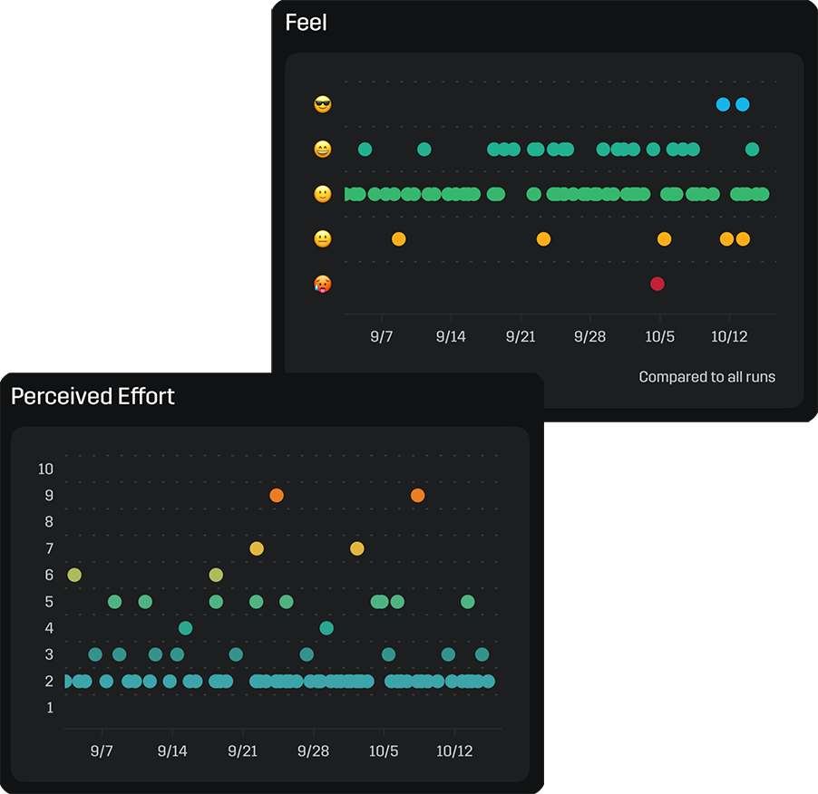 Now, you can quickly identify if you are overexerting yourself with the Feel & Perceived Effort Trends. You can use this information to tell you when you should back off or when you need to push harder in your training.