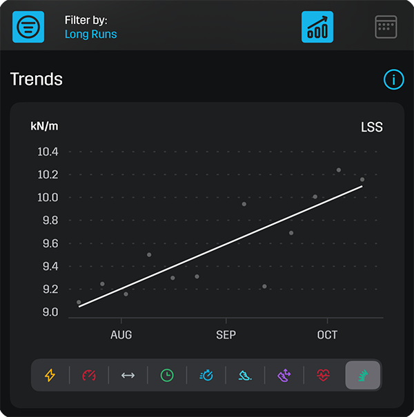 First, let's filter by long runs. Is your average power output, duration, or Leg Spring Stiffness trending upwards or downwards during these activities?