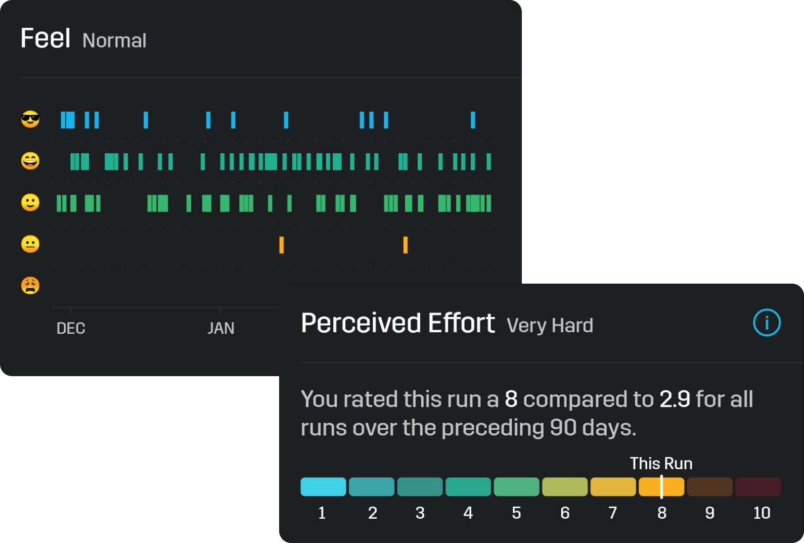 Feel & Perceived Effort cards let you quickly visualize how each run has left you feeling in order to spot under & over training trends.