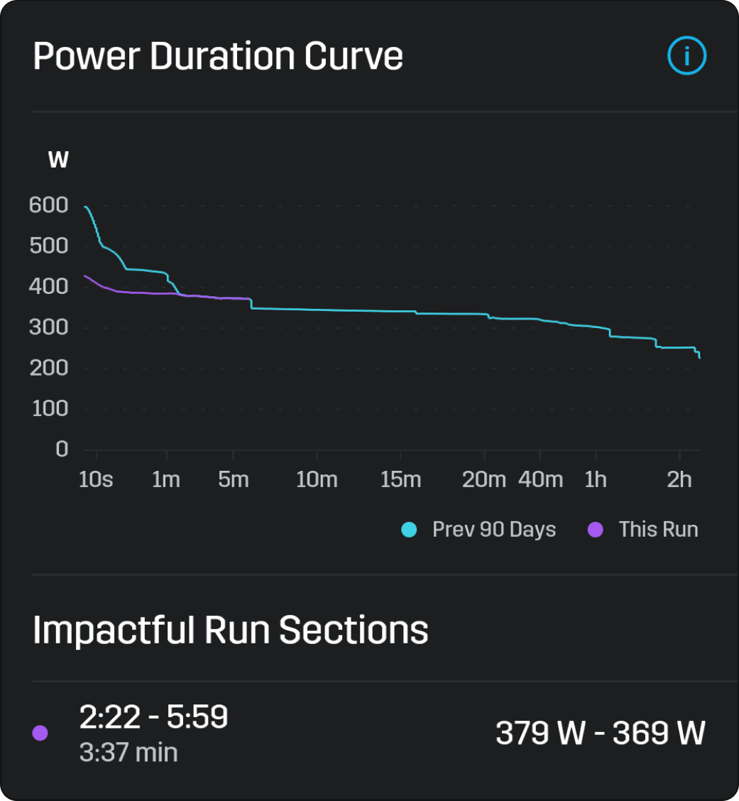 With the Impactful Run Sections in the Power Duration Curve insight card, you can quickly identify runs that are near or exceed your personal best performances.